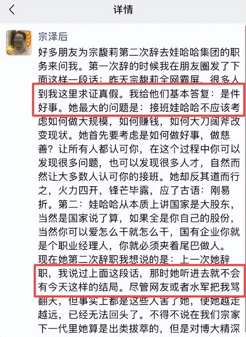 宗泽后声称,宗馥莉离开娃哈哈是“明智之举”,暗示此举对公司发展大有裨益,甚至称这是实现多方共赢的结局。