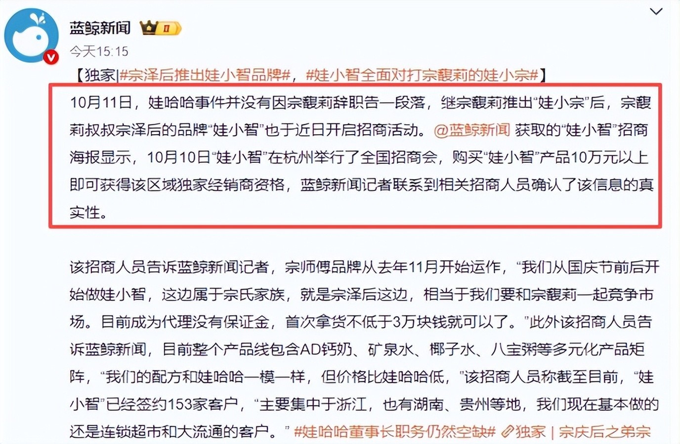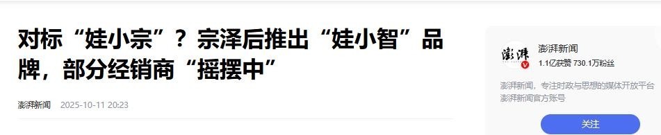 令人意想不到的是,就在“娃小宗”官宣之后,一直对宗馥莉持敌意态度的宗泽后,也紧随其后宣布推出新品牌“娃小智”。
