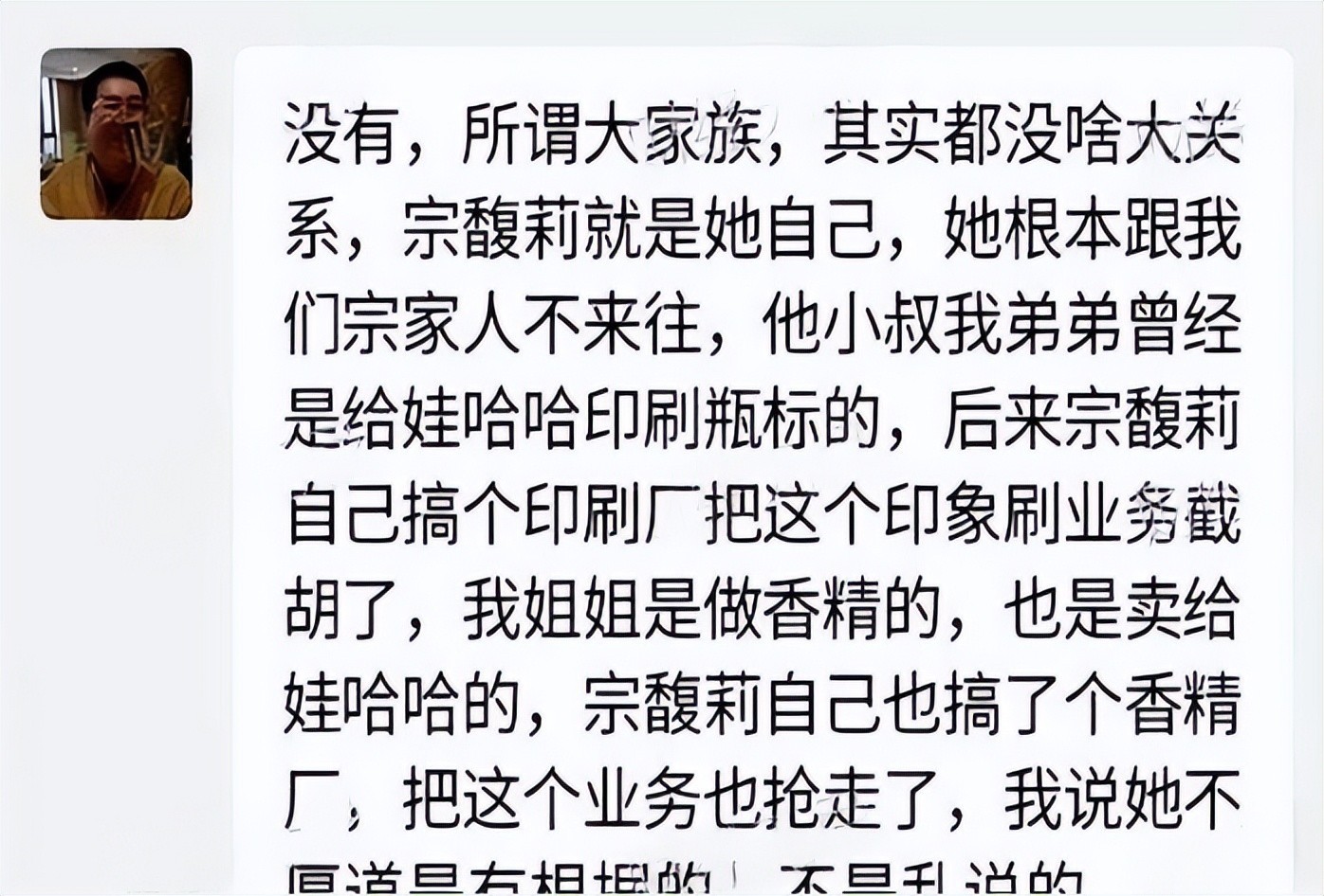通篇措辞充满攻击性,字里行间皆是对亲侄女的贬低与落井下石,明显暴露出他对宗馥莉积怨已久。