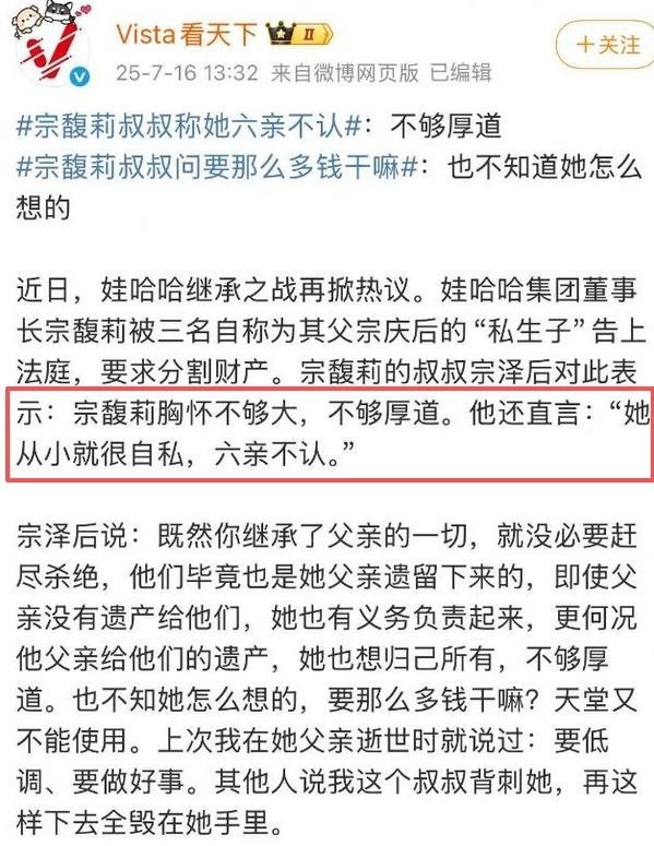 他曾在公开场合指责宗馥莉“六亲不认”,称她从小性格自私,并痛批其争夺遗产的行为违背道德伦理。